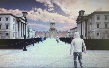 The scene, which uses a crowd simulation system developed by V-SENSE, provides a first-person walk-through of how a student could safely negotiate crowds on campus to reach the library.