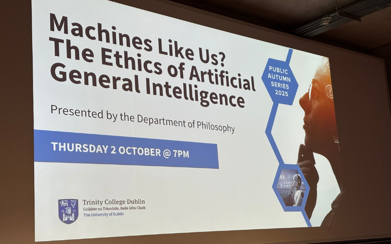 That was the focus of Dr Will Ratoff’s lecture, “Machines Like Us? The Ethics of Artificial General Intelligence,” delivered to a packed JM Synge Theatre on Thursday, 2 October. Dr Ratoff explored the ethical and social challenges posed by machines that could one day equal, or surpass, human intelligence, from their use in warfare to their role in our personal lives.